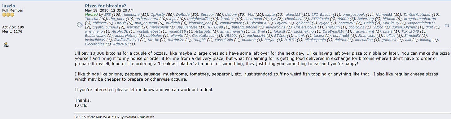 Recordemos que a estas alturas la criptomoneda llevaba poco más de un año en funcionamiento, no tenía valor comercial, y seguía siendo completamente experimental. Era, más bien, un chiche de ingenieros, criptógrafos, desarrolladores, activistas y curiosos. Sin embargo, Laszlo estaba en una misión por lograr la primera compra comercial con bitcoin.